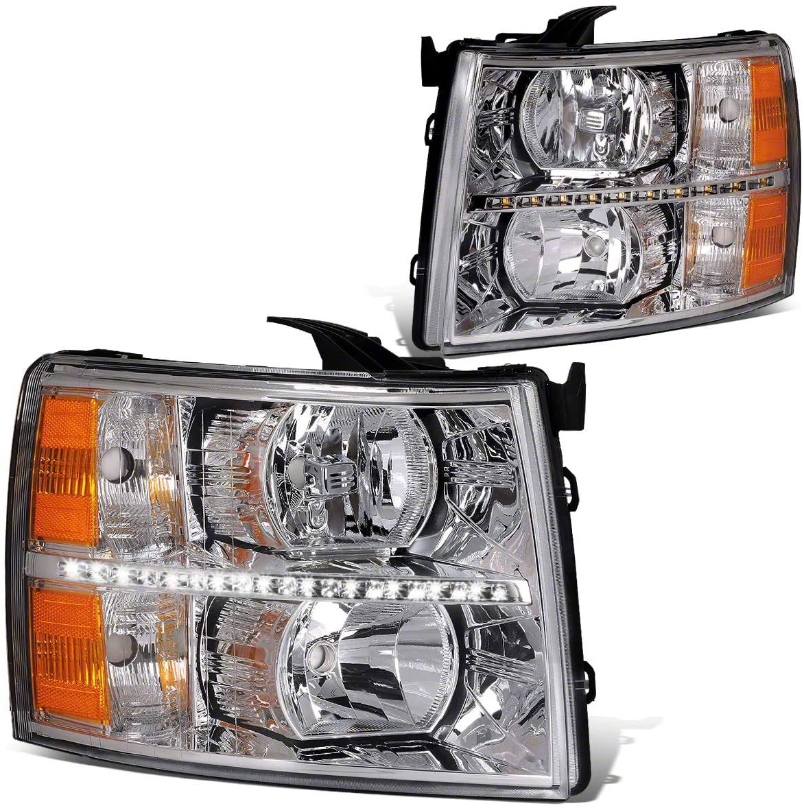 Illumination and Style. Nothing is more important for your safety than headlights and these LED DRL Headlights with Amber Corner Lights; Chrome Housing; Clear Lens are an excellent solution. Your Silverado will receive amazing illumination and even extra style.