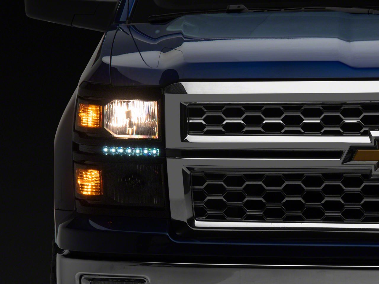 Easy Touch of Style. Looking for an easy way to improve your Silverado's visibility and style? Check out these LED DRL Headlights. These headlights provide superb illumination while adding a touch of style with their black housing and clear lens.