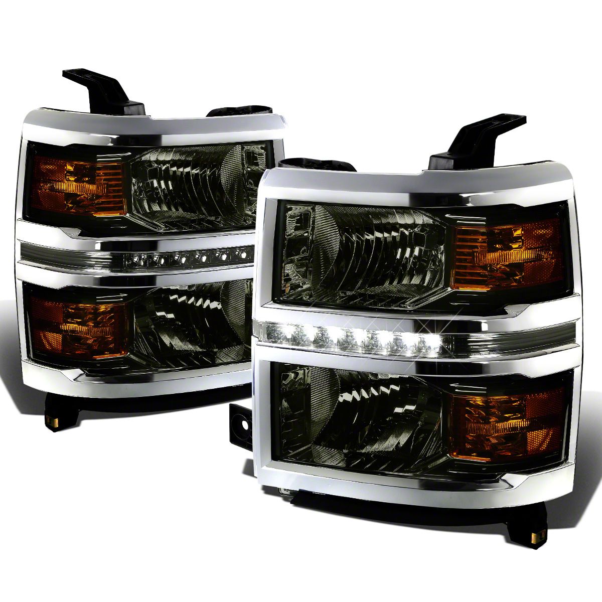 Application. This LED DRL Projector Headlights with Amber Corners (Chrome Housing and Smoked Lens) fits 2014-2015 Silverado 1500.