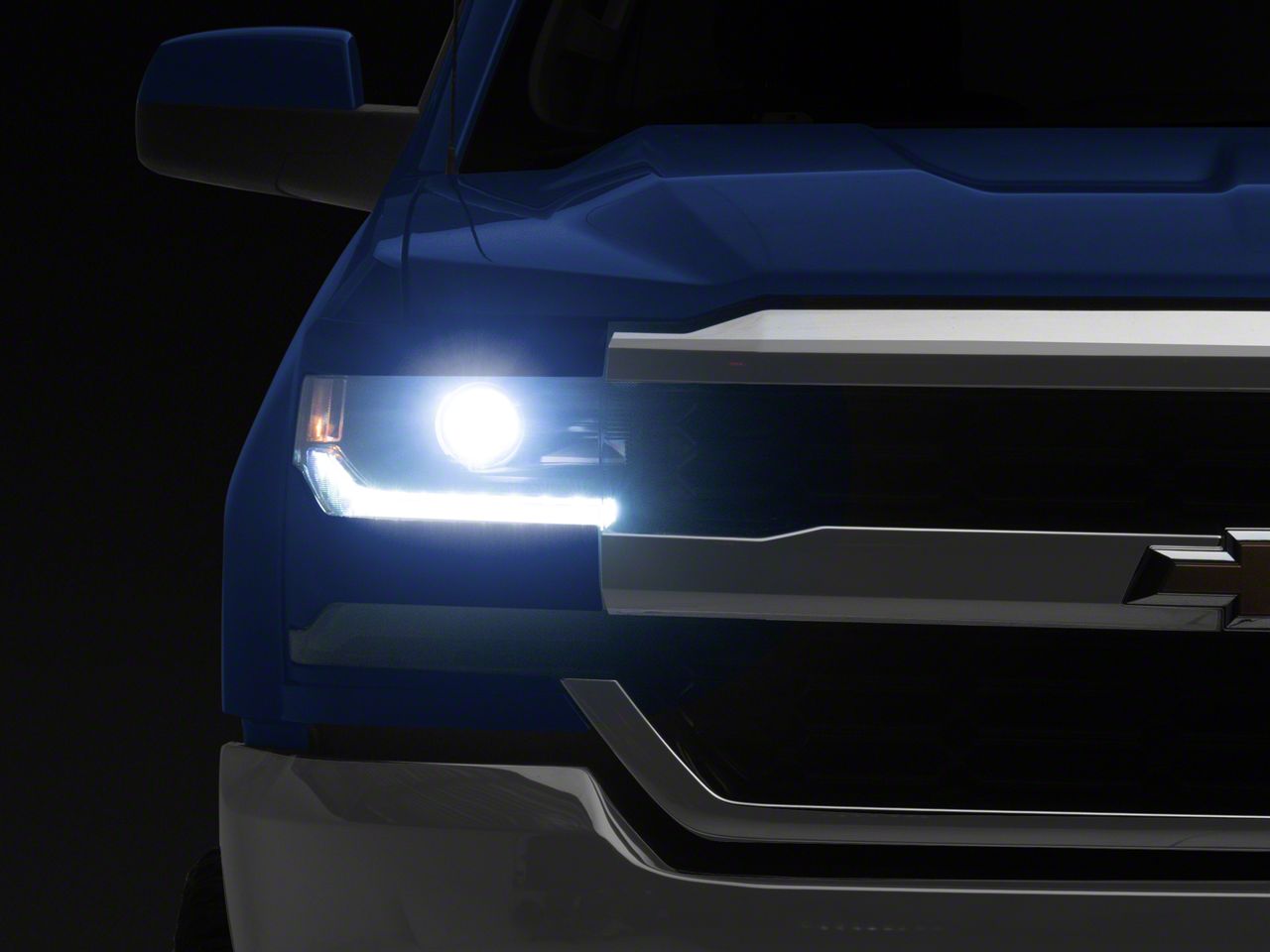 Application. This LED DRL Projector Headlights with Clear Corners in Black Housing and Clear Lens fits all 2016-2018 Chevrolet Silverado 1500 models with Factory HID Headlights.