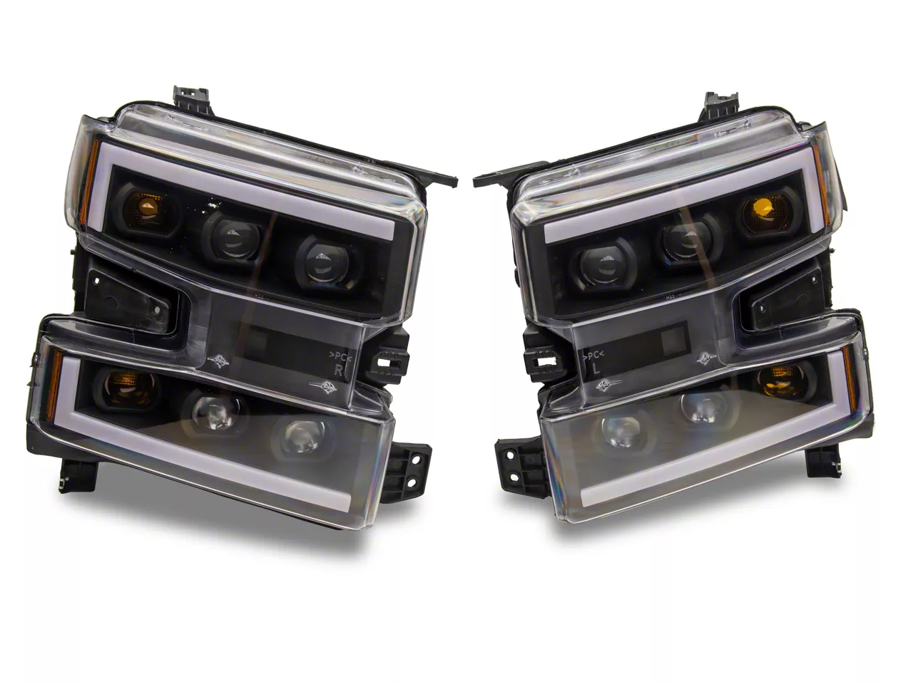 Superior Lighting. If you are looking for the brightest lights to mount on your Silverado than this LED DRL Quad Projector Headlights with Amber Corners; Black Housing; Clear Lens is a contender worth considering. Sporting a four-projector style light system, it featured an LED DRL for and amber corner lights for better signaling in the dark. The dual lights use bright H1 bulbs for both its high and low beam to get you through the darkness.