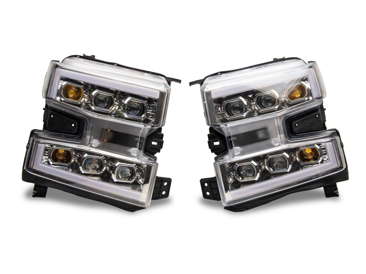 Application. The LED DRL Quad Projector Headlights with Clear Corners; Chrome Housing; Clear Lens fits 2019-2021 Silverado 1500 with Factory Halogen Headlights.