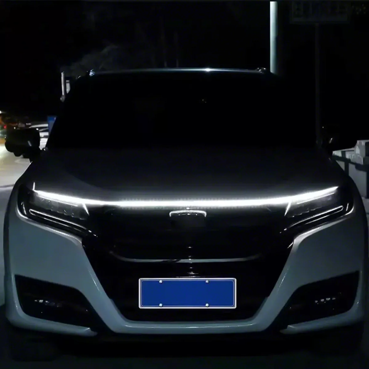 Futuristic Flair and Enhanced Safety. The LED Knight Rider Scanning Hood Brow DRL Flex Cool White Kit transcends a simple under-the-hood project. It transforms your vehicle's appearance and functionality. Let's explore the dynamic impact it brings to your ride.