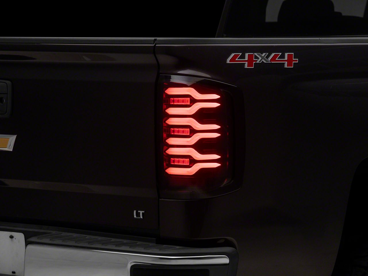 Standard OEM Design. Choose the LUXX-Series LED Tail Lights; Black Red Housing; Smoked Lens if you want standard-style illumination for your Silverado. The high-performance fiber optic LED bulbs in this tail light are designed to provide over 1200 lumens of intensity, outshining factory-built rear lights in regards to lighting power, allowing for pleasant and clear visibility through foggy situations.