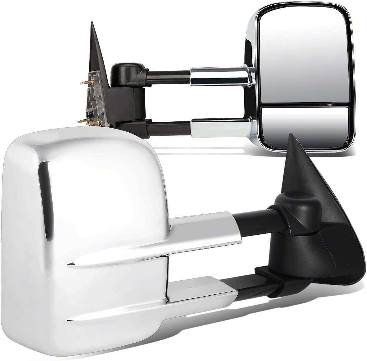 Chrome Finished Cover. Elevate the functionality and style of your Silverado 1500 with these Manual Towing Mirrors, designed for drivers who demand both performance and aesthetic appeal. These mirrors feature a manual telescoping function, allowing you to easily adjust the mirror's length based on your towing needs, ensuring a clear and broad view of the road behind you. The chrome-finished mirror cover adds a touch of elegance and sophistication to your Silverado 1500, enhancing its overall exterior look.