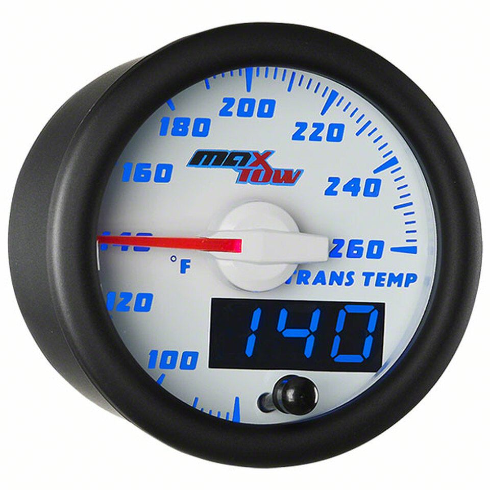 Keep an Eye on Transmission Health with MaxTow Temperature Gauge. This transmission temperature gauge is designed for vehicle enthusiasts who want precise control over their transmission’s performance. Its white and blue face, combined with bright LED backlighting, ensures easy readability in both day and night conditions. With a range from 80°F to 260°F, this gauge helps you monitor transmission heat levels, crucial for extended drives and towing.