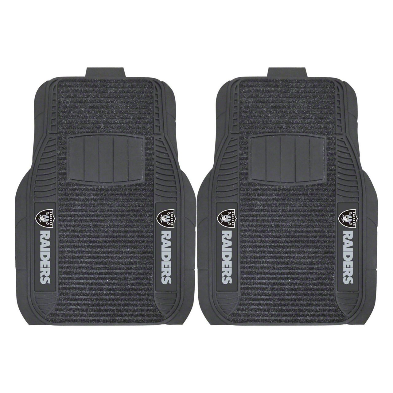 Application. These Molded Front Floor Mats with officially-licensed Las Vegas Raiders logo feature a universal design so they will fit most makes and models of vehicles. These Mats can be trimmed to fit if necessary. Sold as a set of two Front Mats.