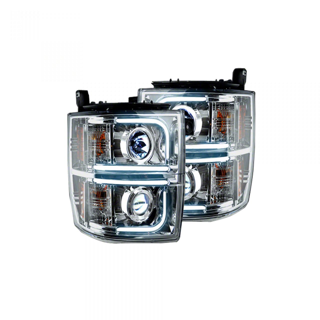 Application. This OLED Halo Projector Headlights; Chrome Housing; Clear Lens fits all 2014-2015 Silverado 1500 models.