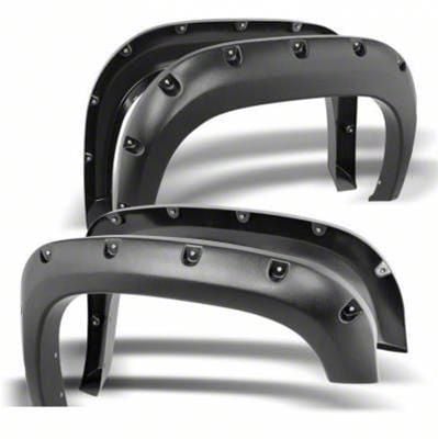 Construction and Appearance. Finished in a sleek, glossy black, these fender flares are built for both style and function. Their durable construction resists cracking, fading, and weathering, while the pocket style design adds a commanding visual edge to your truck. The high-gloss finish makes them stand out and provides a clean, polished contrast against any factory paint color.