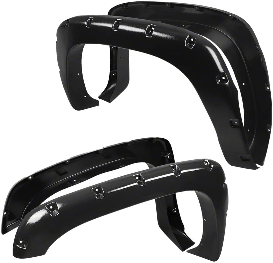 Leveled Up Style and Extra Protection. Give your Silverado 1500 both style and protection when you install these Pocket Style Fender Flares in Textured Black. These fender flares feature a simulated riveted style and a 4-inch front, and 4.25-inch rear height to give your truck a brawny style upgrade. What’s more, these flares extend your fenders’ coverage by about 2 inches all around. This feature, when combined with the flares' sturdy construction, provides practical side protection against kicked-up debris.