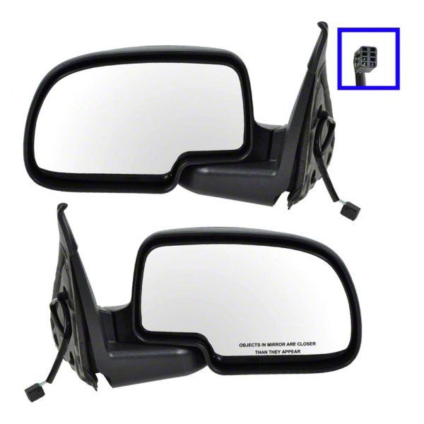 Repaired Viewing. Keep yourself aware while driving your Silverado with this Powered Mirrors; Flat Black. Designed to be an immediate fix to your shattered glass, or failing electrical components, this Powered Mirror Assembly offers a precision fit mounting system with compatible wiring and seamless compatibility with the rest of your hardware. It features a factory black color with plug and play connectors for a less hassle repair.