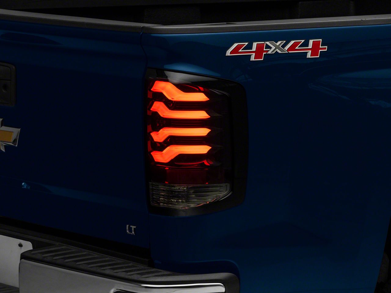 Cutting Edge Style and Illumination. Advance your rear-end look while also upgrading visibility with PRO-Series LED Tail Lights; Jet Black Housing; Smoked Lens. These tail light assemblies’ cutting edge style is characterized by angular LED tubes and a dark color scheme. These design elements come together to give your Silverado’s rear section a fierce new look. What’s more, these LED tubes get their illumination from high-quality LED chips capable of providing brilliant illumination to improve rearward visibility.