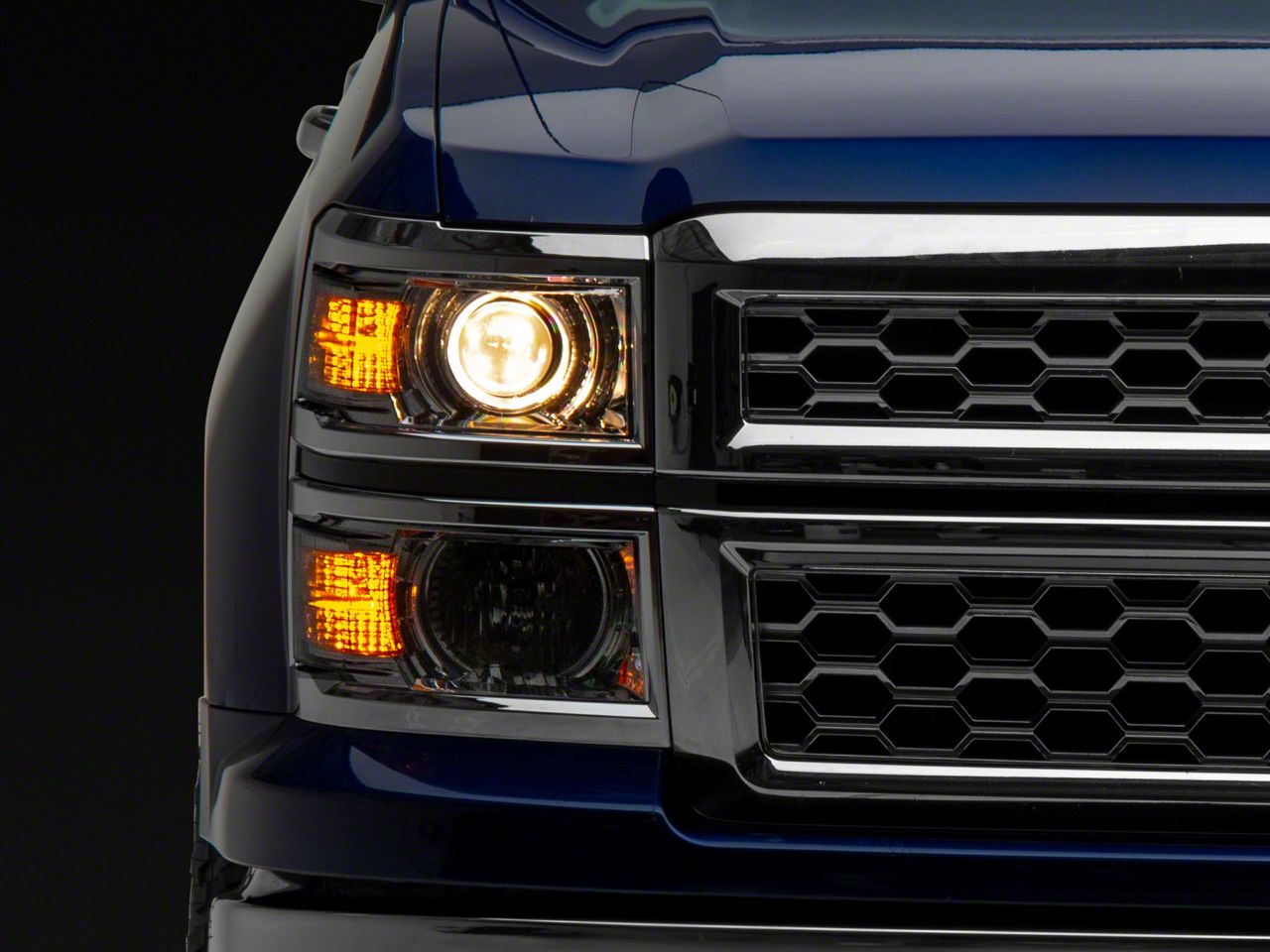 Application. This pair of Projector Headlights with Chrome Housing and Clear Lens is intended for use on all 2014 to 2015 Chevrolet Silverado 1500 models.