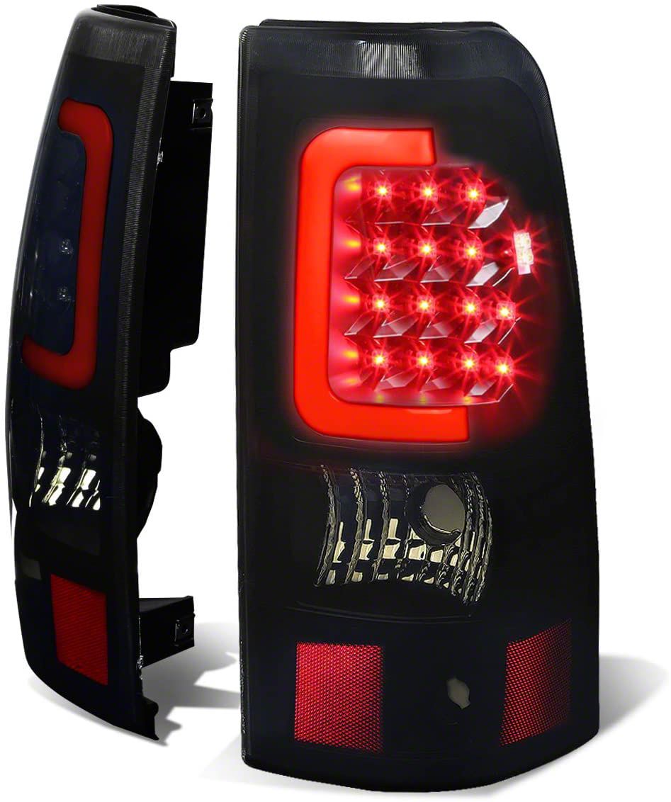 Application. The Dual Red C-Bar LED Tail Lights; Black Smoked; fits all 2003-2006 Silverado 1500 Fleetside.