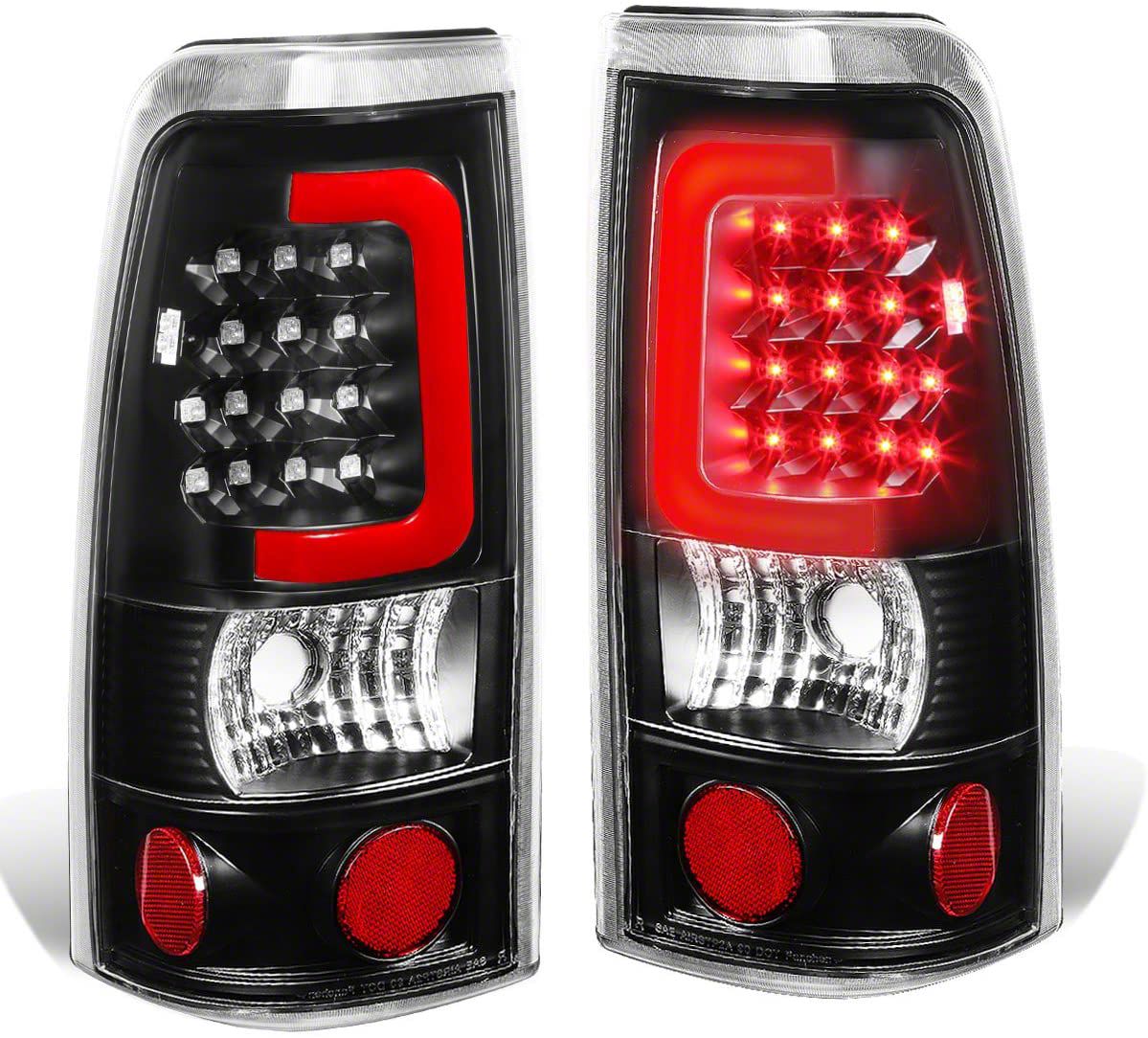 Application. The Dual Red C-Bar LED Tail Lights; Black; fits all 1999-2002 Silverado 1500 Fleetside.