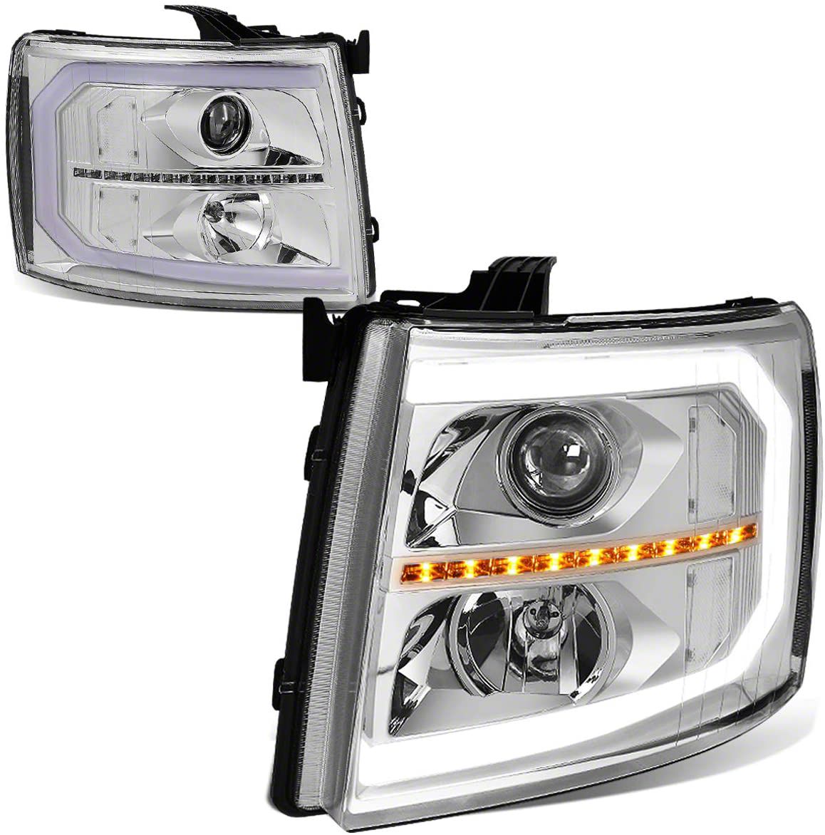 Bolder Driving Confidence. Let your Silverado course through the dark roads while sporting a striking front-end look. These Sequential Turn Signal Projector Headlights with Clear Corners; Chrome Housing; Clear Lens are perfect replacements for your factory lights. Alongside the style boost and custom look, this pair of lights reinforces your road safety as it projects powerful, evenly dispersed, long-range illumination.