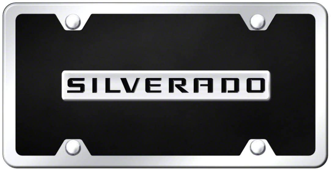 Bolder Style and Appeal. Customize your Chevrolet Silverado’s all-terrain style by using this Chrome on Black Silverado License Plate. This license plate assembly offers a simple and an instant fiercer appeal to your truck’s exterior. With this badge on your front end, your Silverado will surely show some aggressive style that befits its mighty stance.