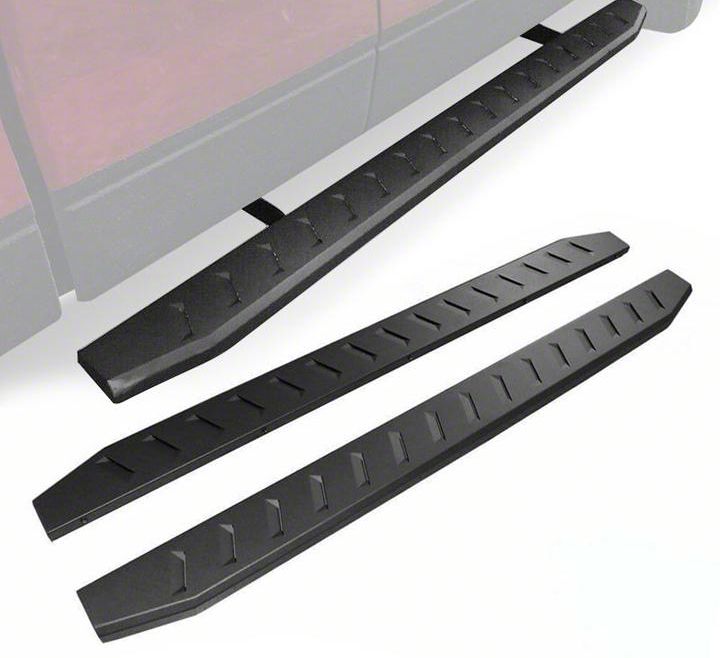 Enhanced Comfort, Safety, and Style. Get into your Silverado with comfort and ease by using these Steel Running Boards in Black. These platforms feature slotted step areas along the entire length of the boards to provide you with secure footings under all types of weather and environments. Furthermore, the boards offer incredible side protection by blocking the debris tossed by the wheels that could scratch or damage the door surface and side panels. The all-black assembly of the textured black step boards with anti-slip patterns adds a rugged detail to your Crew Cab’s tough exterior.