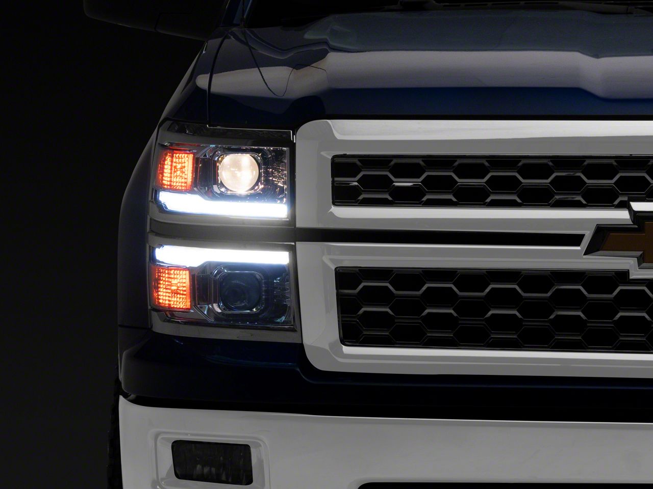 Application. This pair of Switchback Sequential LED Bar Projector Headlights with Chrome Housing and Clear Lens fits 2014 to 2015 Chevrolet Silverado 1500 models.