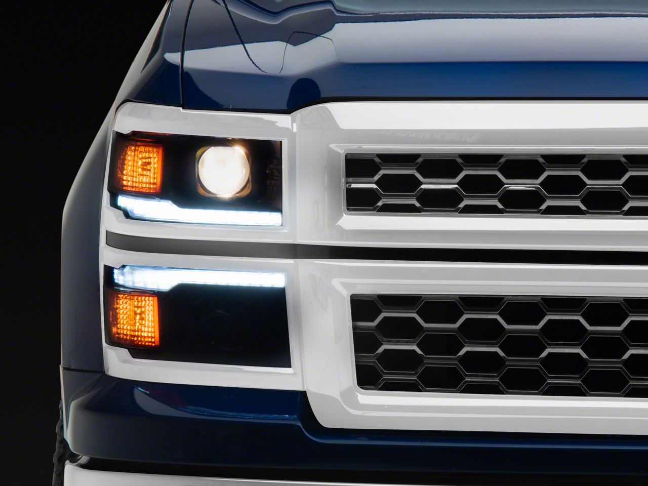 Application. These Switchback Sequential LED Bar Projector Headlights with Matte Black Housing, Clear Lens, and Chrome Trim are intended for use on all 2014 to 2015 Chevrolet Silverado 1500 models.