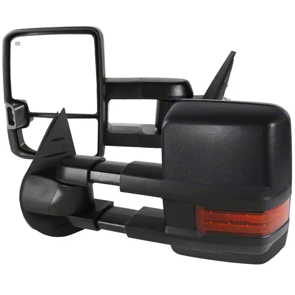 Enhanced Visibility. This Towing Mirror Pair improves both your vehicle's visibility and your perspective of the road. The mirrors work in coordination with your signal lights thanks to itsintegrated lighting elements. The additional glow also alerts drivers to the Side Mirror Assembly's longer length which makes it safer for the highway.