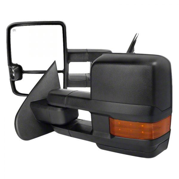 Style and Function. The Powered Heated Towing Mirrors with Amber Turn Signals is a high-quality upgrade for your vehicle's towing capabilities. The mirrors are equipped with power adjustability and heating features, allowing you to easily adjust the mirror angle and defrost ice or fog for improved visibility in harsh weather conditions. The heated feature is easily controllable, providing a clear view of the road behind you even in cold temperatures.