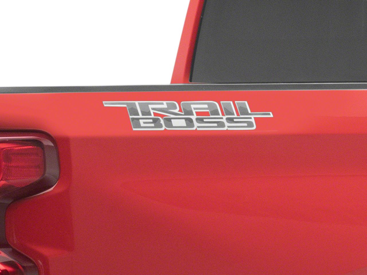 Bed Side Decals. Update the exterior styling of your 2019-2026 Chevrolet Silverado 1500 with a pair of officially licensed Trail Boss Decals that feature a Gray and Dark Gray design. These officially licensed decals are printed on the highest quality vinyl material using the exact same fonts and logos that are used by Chevrolet when creating their very own products.