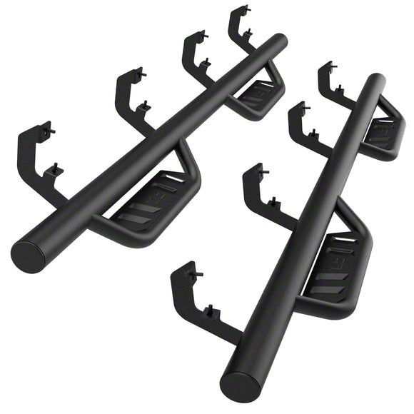 Construction and Appearance. Crafted from premium tubular carbon steel, these step bars feature a fine textured black powder-coated finish, making them rust and corrosion-resistant. Their robust construction ensures long-lasting durability while complementing the sleek look of your vehicle.