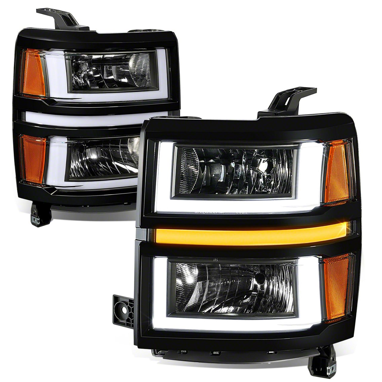Advanced LED Headlight Design. The U-Shaped LED DRL Sequential Headlights with Amber Corners are designed to provide superior lighting performance and a modern look for your Chevrolet Silverado 1500. With a white LED light bar for parking and sequential amber LED turn signals, these headlights ensure enhanced visibility and style.