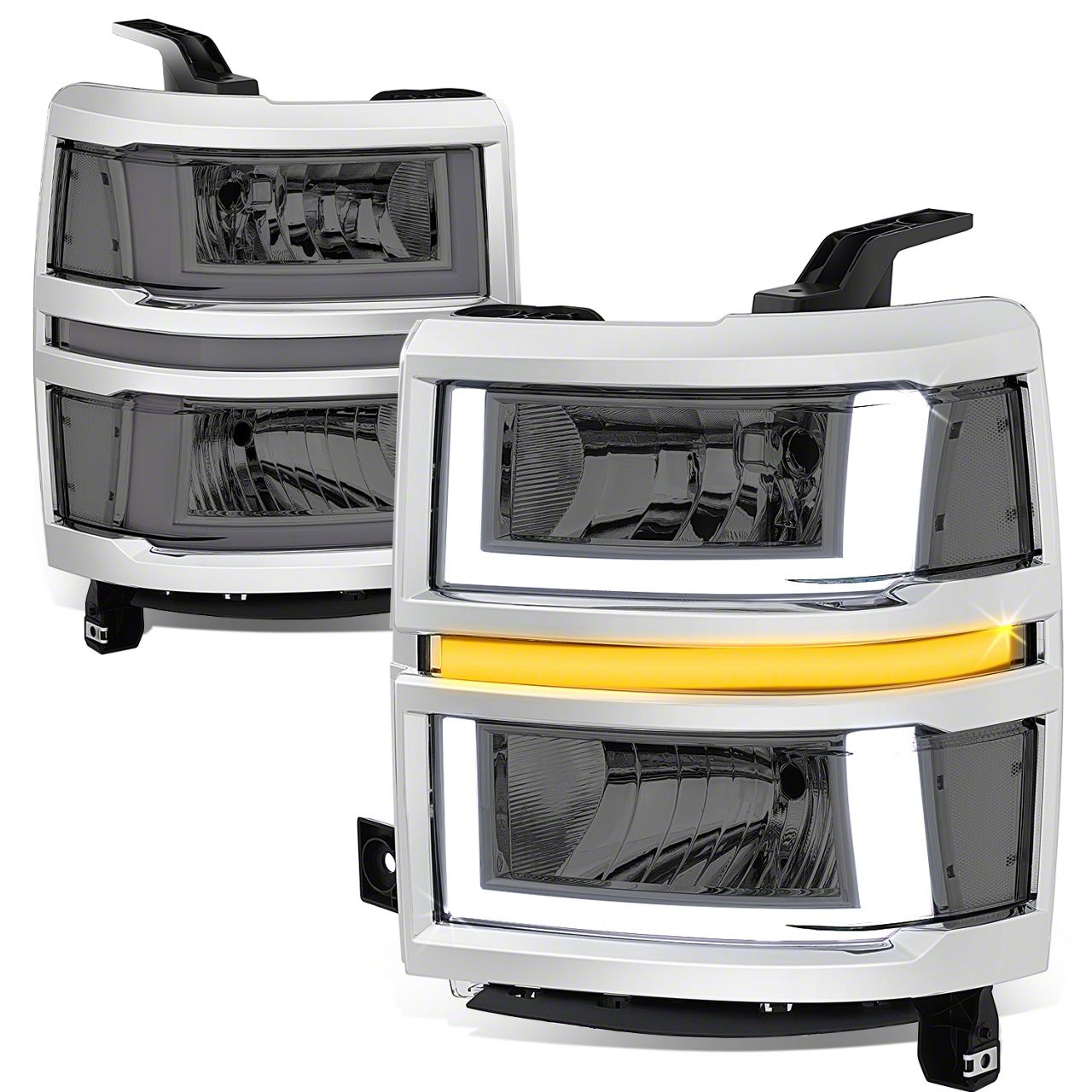 Stylish and Functional Lighting Solution. Elevate the appearance and functionality of your Silverado with these U-Shaped LED DRL Sequential Headlights. Designed with a modern smoked lens and clear corners, these headlights offer a sleek aesthetic that complements your vehicle's bold design. The sequential turn signals not only enhance visibility but also add a sophisticated touch, ensuring your vehicle stands out on the road.