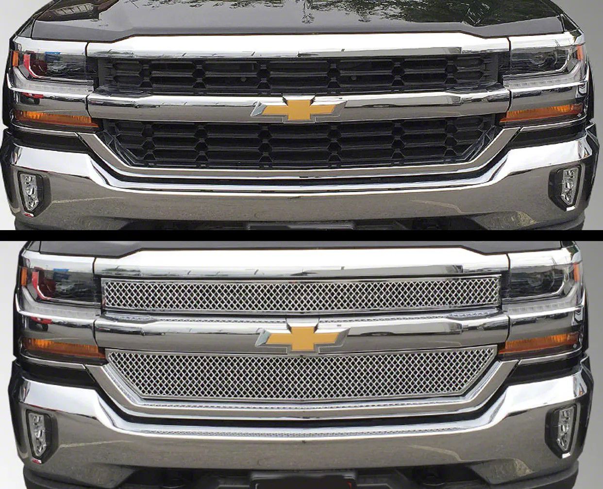 Full Chrome Look. This pair of Chrome Grille Overlays from AmericanTrucks will make the front of your Silverado pop for the full chrome front-end look. The two durable, chrome-plated ABS overlays install easily on top of your existing black plastic OEM grilles, giving you a cross-hatched mesh chrome grille pattern that will help your truck to stand out from the rest without even turning a screwdriver.