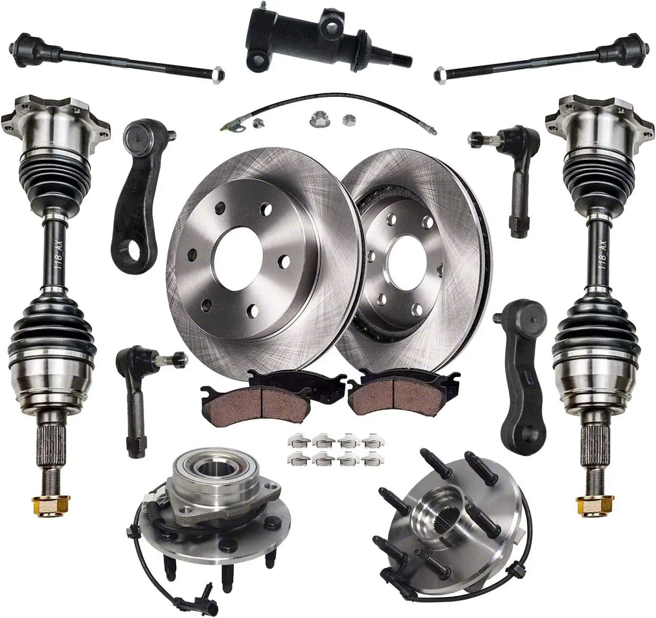 Complete Front-End Overhaul Kit. The Vented 6-Lug Brake Rotor, Pad, CV Axles, Wheel Hub Assemblies, Idler Arm, Pitman Arm and Tie Rod Kit (Front) is a comprehensive front-end replacement kit designed for 1999–2006 4WD Chevrolet Silverado 1500 models equipped with rear disc brakes. This kit includes vented 6-lug front brake rotors, ceramic brake pads, CV axles, wheel hub assemblies with ABS sensors, idler arm and bracket, pitman arm (4-groove), and inner and outer tie rod ends. It provides all necessary components to restore optimal steering, braking, and suspension performance.