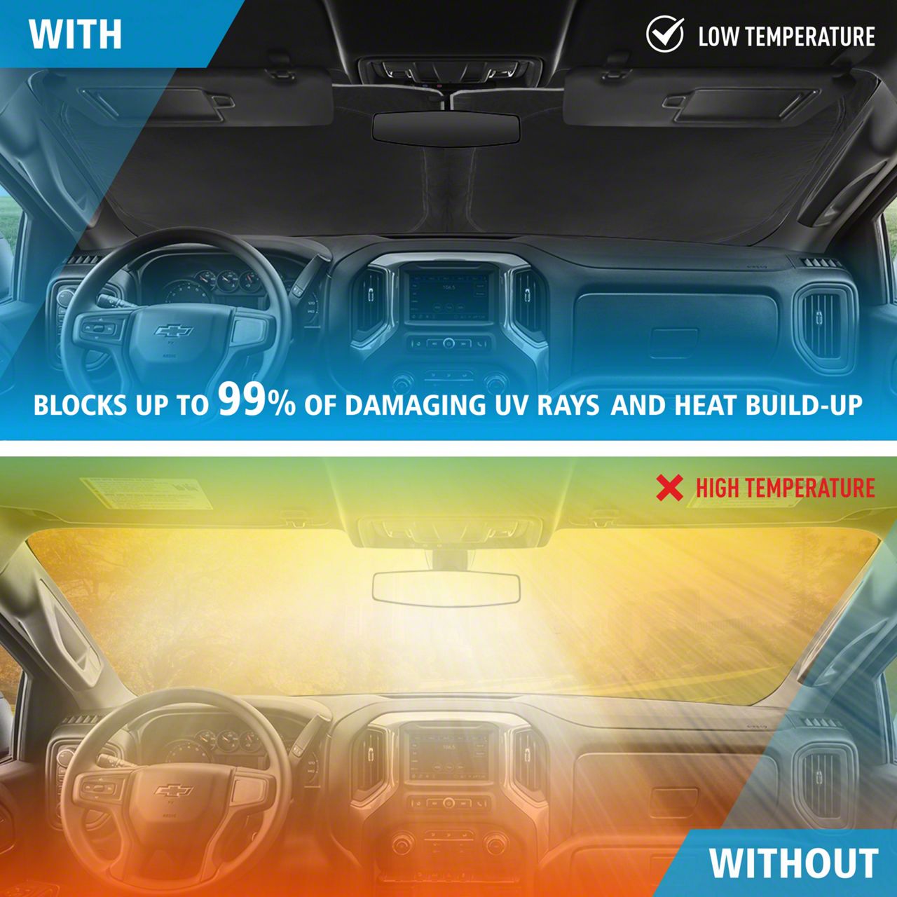 Superior Heat Reduction. The Windshield Sun Shade is crafted from high-quality, reflective material that effectively blocks out heat and keeps your truck's interior cool even on the hottest days. Say goodbye to scorching hot steering wheels and seats, and enjoy a comfortable and pleasant driving experience. The sun shade's UV-resistant material helps to protect your Silverado's dashboard, upholstery, and other interior components from the harmful effects of the sun. Prolong the life of your truck's interior while maintaining its appearance and value.