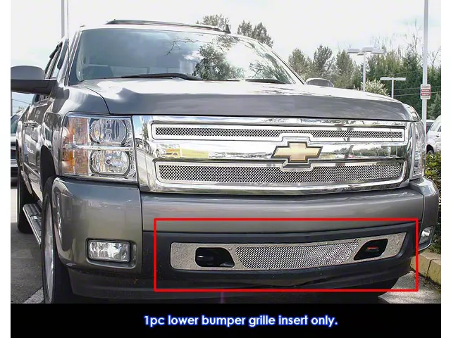Application. This Lower Bumper Grille Overlay fits 2007–2013 Chevrolet Silverado 1500 models. Ideal for drivers looking to upgrade the aesthetics and protection of their front bumper, it combines functionality with a custom, polished look. With its durable wire mesh design, corrosion-resistant construction, and easy installation, this grille overlay delivers both style and practicality, enhancing the vehicle’s overall presence and performance protection.