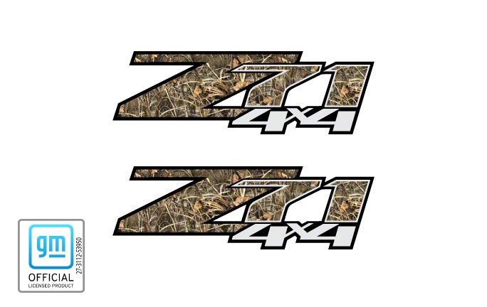 Bed Side Decals. Update the exterior styling of your 2007-2013 Chevrolet Silverado 1500 with a pair of officially licensed Z71 4x4 Decals that feature a Camo Realtree Max4 design. These officially licensed decals are printed on the highest quality vinyl material using the exact same fonts and logos that are used by Chevrolet when creating their very own products.