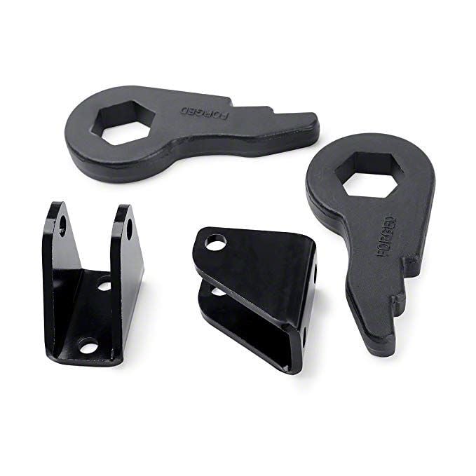 This torsion key lift kit, made of high-strength forged carbon steel with a black powder-coated finish for corrosion resistance, provides 1"–3" of lift with twice the strength of the factory system, requires no modifications or drilling for an easy 2–4 hour installation, and allows you to level your vehicle either by matching the lift to the difference between front and rear heights or by applying the same lift to both ends while retaining the stock look, with professional installation highly recommended.