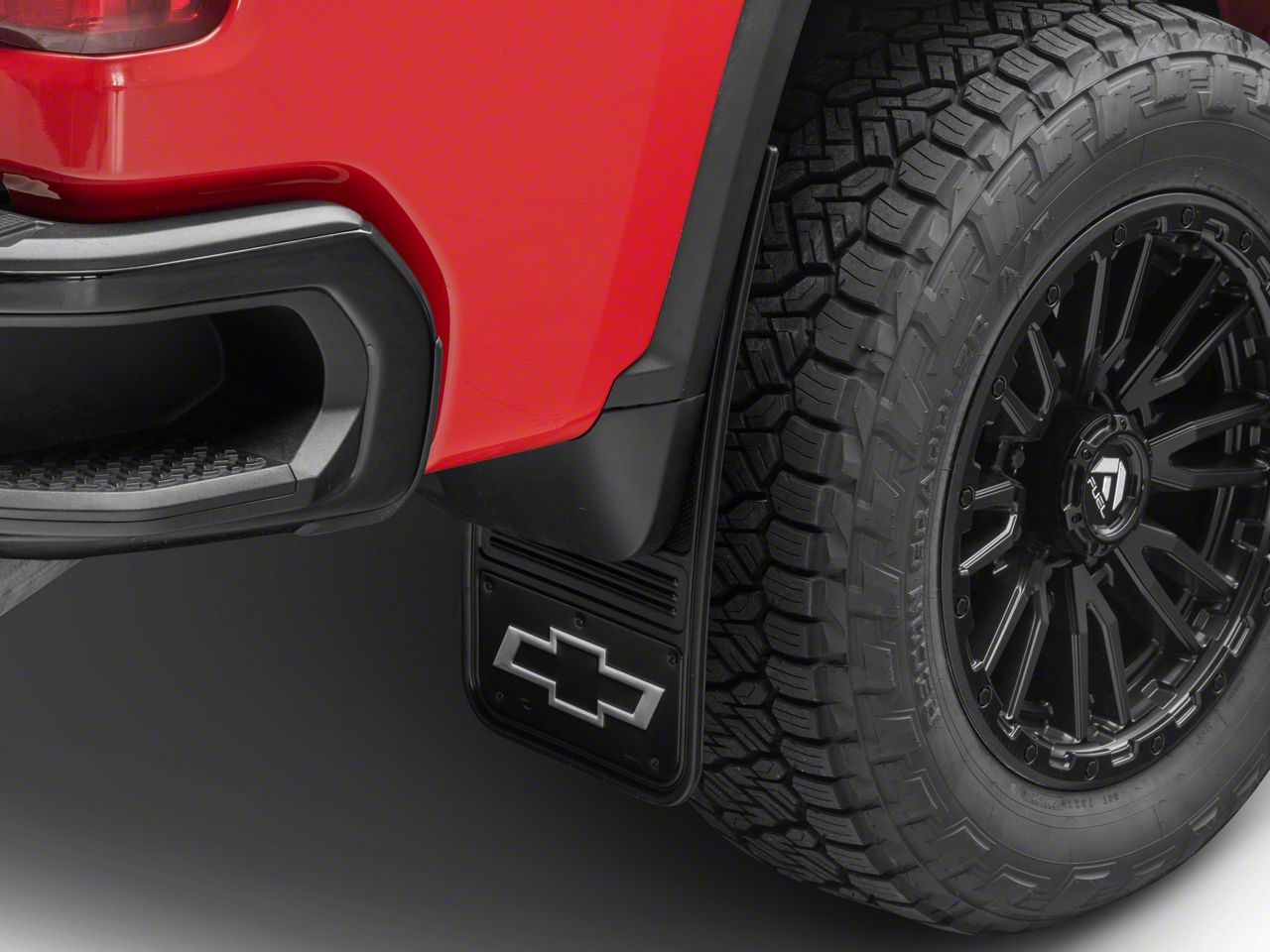 Long-Lasting Protection. Measuring 12 inches by 23 inches, these mud flaps are a perfect fit for Chevrolet trucks and SUVs, and they can be easily installed on either the front or rear wheels. These mud flaps are made from high-quality materials, ensuring a durable and long-lasting construction that will withstand the toughest driving conditions. Not only do they provide top-notch protection, but they also enhance your truck's appearance with their stylish design.
