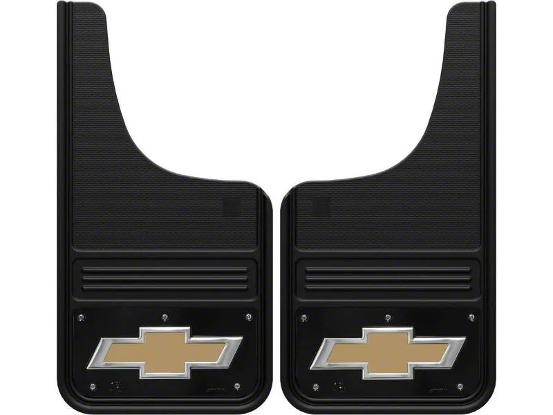 Heavy-Duty Add-On. Introducing the 12-Inch x 23-Inch Mud Flaps with Gold Bowtie Logo, the perfect addition to your vehicle's exterior for added protection and style. These mud flaps are designed to fit both the front and rear of your vehicle, making them a versatile option for any driver. With these mud flaps installed on your vehicle, you can enjoy a cleaner, safer ride while also adding a unique touch of style.
