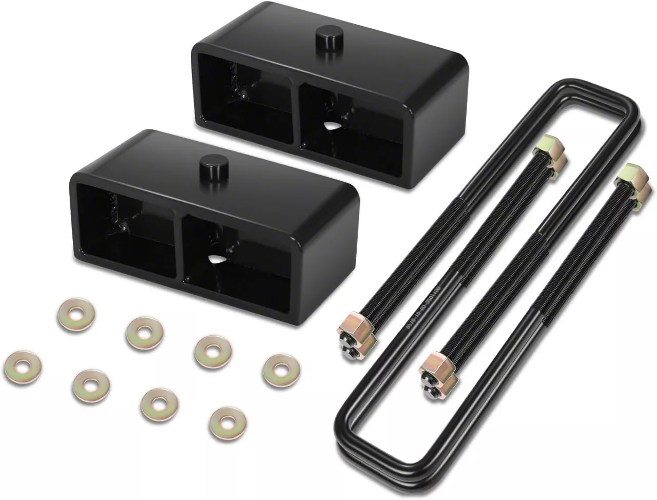 Construction and Appearance. Each component in this kit is finished in matte black for durability and a clean, factory-inspired appearance. The lift blocks, U-bolts, nuts, and flat washers are manufactured for strength and long-lasting performance under the demands of lifted suspension setups. Quality materials ensure resistance to corrosion and wear, supporting both daily driving and off-road use with confidence.