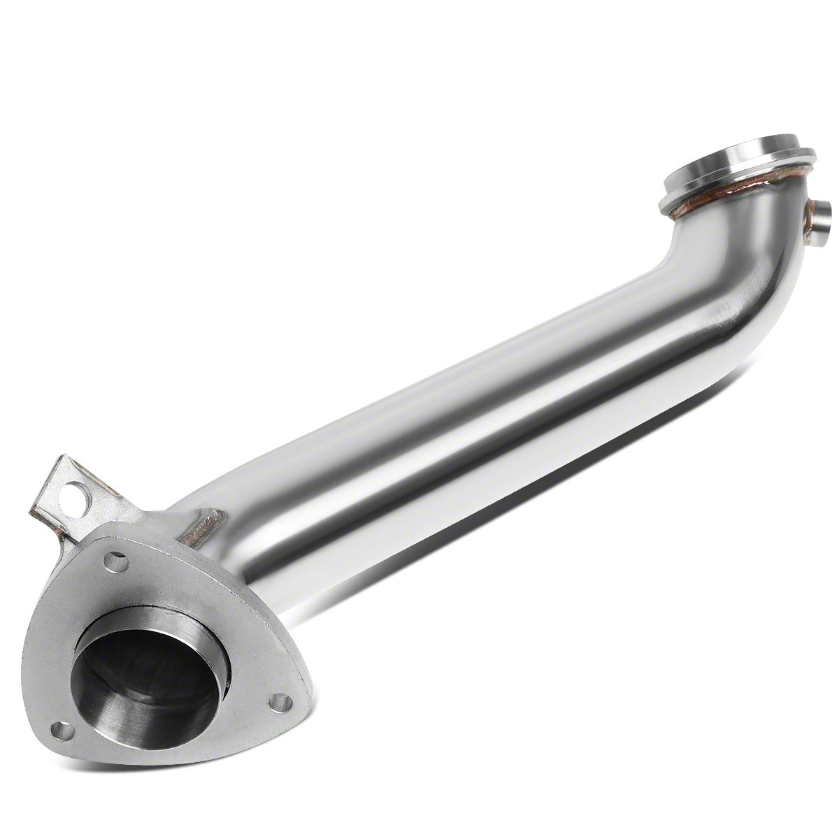 Construction. This Downpipe is built from 3-inch stainless steel with computerized mandrel bends. This means strength, while the downpipe removes restrictions and reduces exhaust gas temperatures. There is a high-performance racing spec design and a TIG-welded, CNC-machined flange to combat pressure and corrosion.