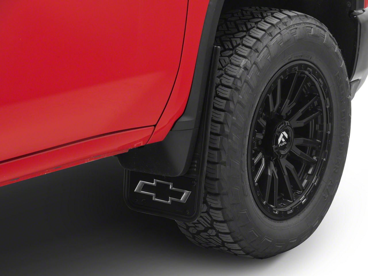 Application. The Black Wrap No-Drill Mud Flaps with Bowtie Logo; Front and Rear fits all 2020-2026 Chevrolet Silverado 2500 HD models.