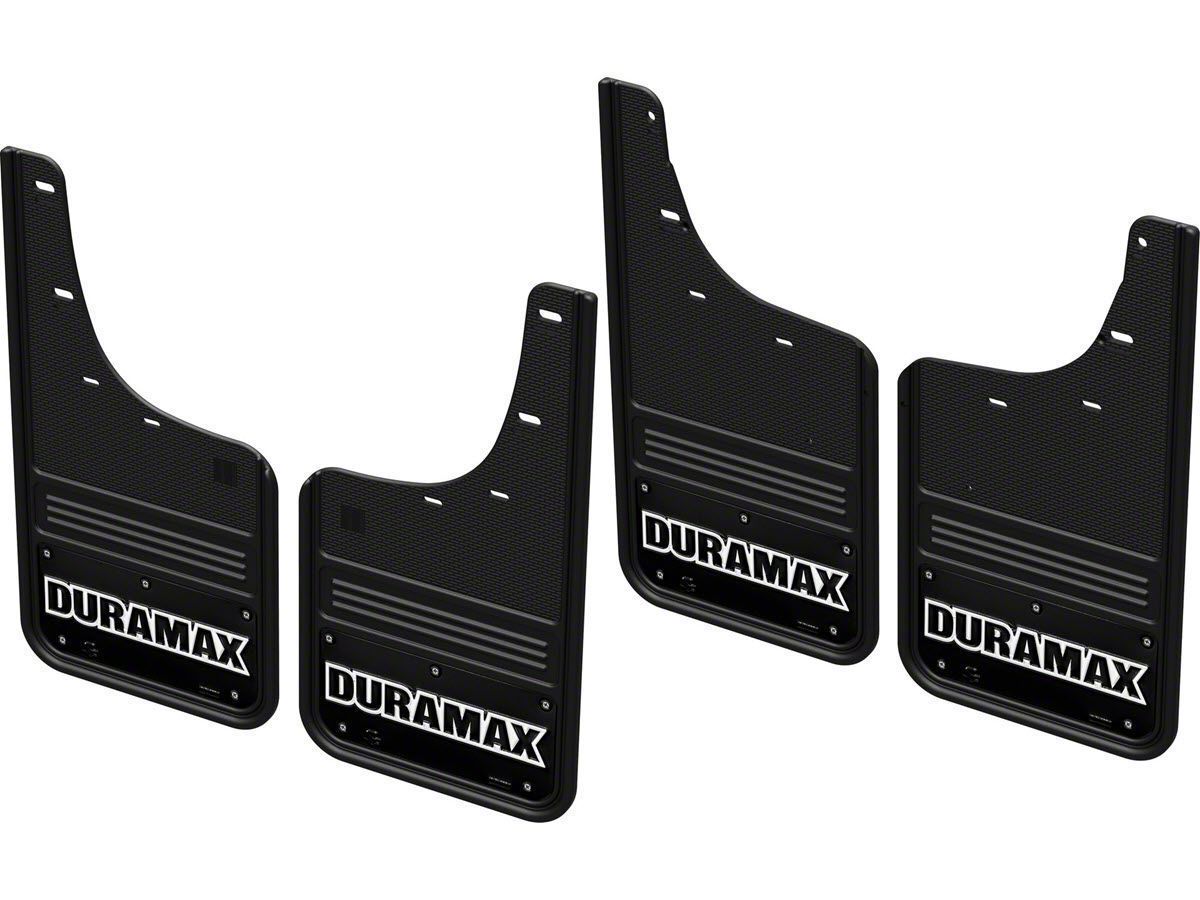 Construction and Design. Made from heavy-duty black wrap material, these mud flaps are durable and built to withstand harsh conditions. The embossed Duramax logo adds a custom touch, showcasing brand pride while enhancing the truck's overall appearance. Precision-cut for an exact fit, these mud flaps blend seamlessly with your vehicle's design.