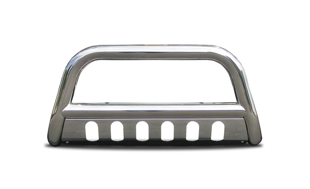 Steelcraft Bull Bar highlights include heavy duty one piece construction, pre-drilled holes for auxiliary lights, removable skid plate, and easy no drill installation. Semi gloss black finish with 3 year warranty