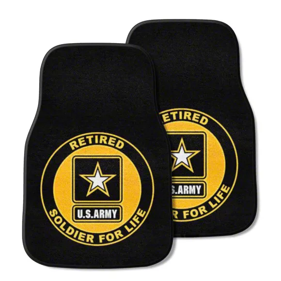 Application. This Carpet Front Floor Mats with U.S. Army Retired Logo fits universal applications.