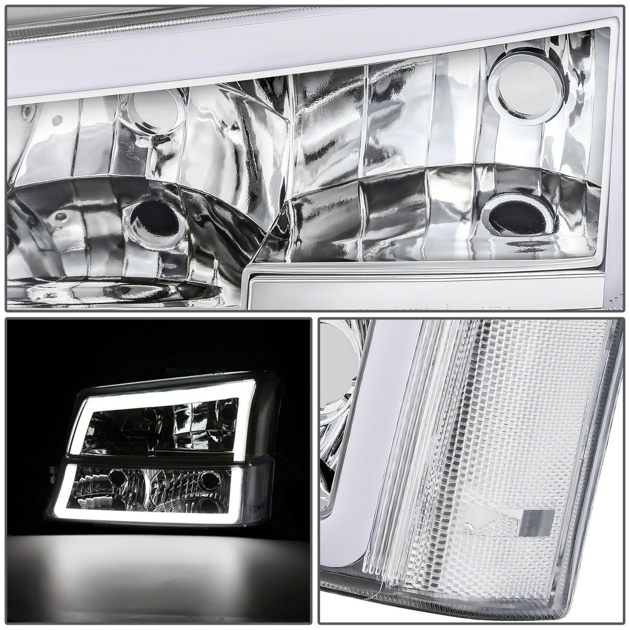 Construction and Features. Featuring a polished chrome housing and clear transparent lenses with matching corners, these headlights ensure durability and a high-end finish. The dual C-bar LED daytime running lights (DRL) enhance visibility during the day and add a distinctive styling element to your vehicle. Built to OE-compatible standards, they guarantee reliable performance and longevity.