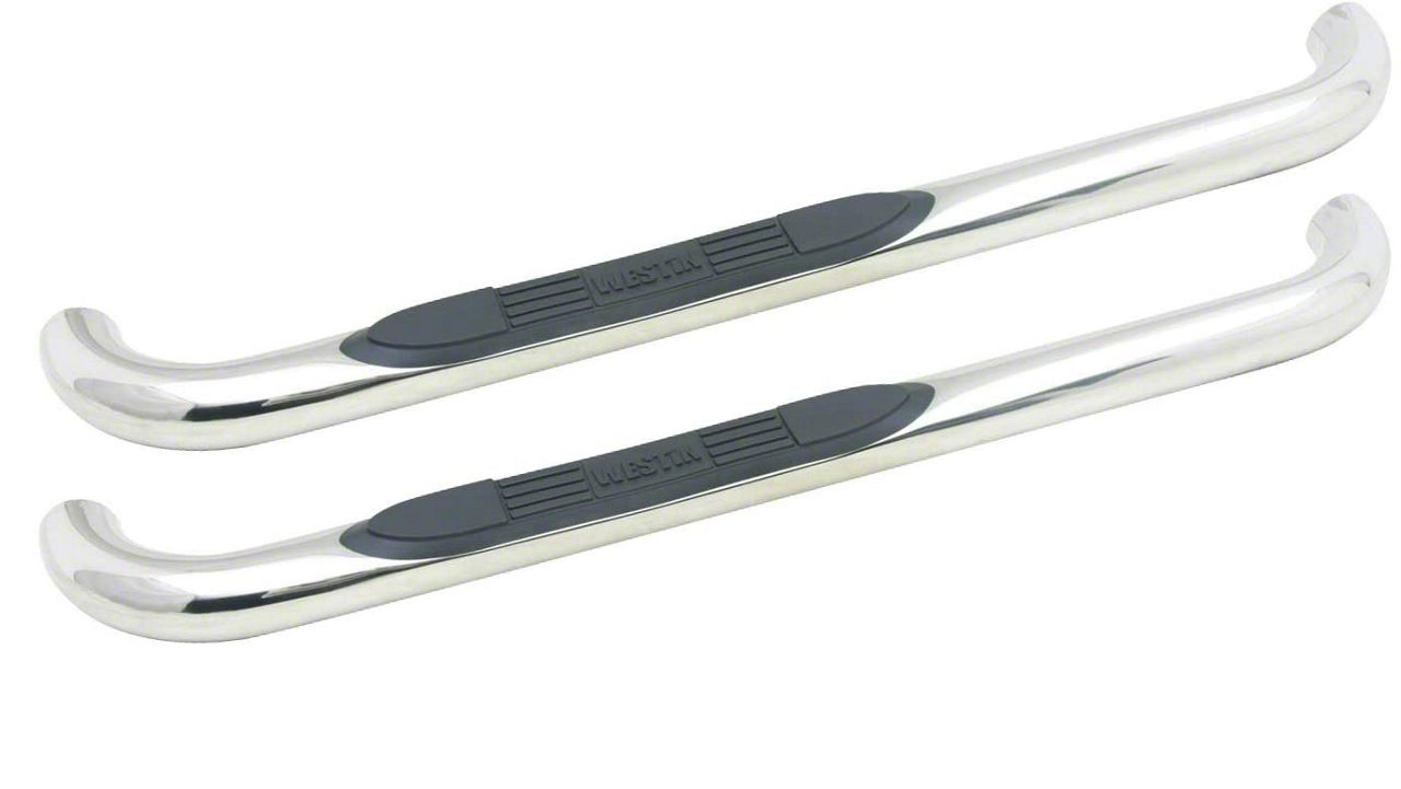 Outstanding Step Bars. Mount your work truck more safely and stylishly than ever with these Stainless Steel E-Series 3-Inch Nerf Side Step Bars. They feature a recessed stepping area that is equipped with high-quality polymer pads for a more secure footing. These step bars’ heavy-duty construction also provide outstanding lower body protection to keep your vehicle safe from damage caused by large trail objects, allowing you to drive on rugged roads with complete confidence in your safety.