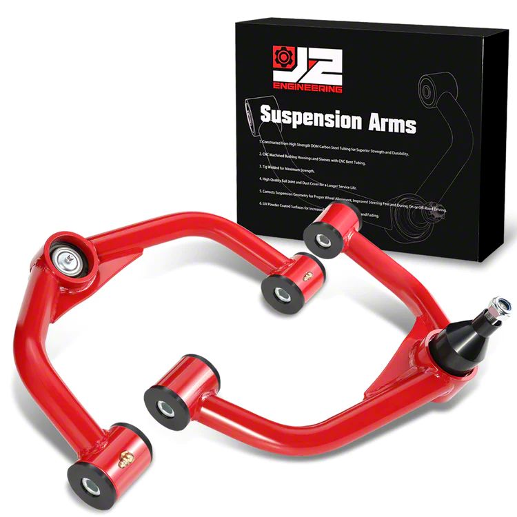 Superior Suspension Upgrade. The Front Upper Control Arms are constructed with a combination of copper and steel materials, ensuring both durability and strength. The CNC-machined and heat-treated features guarantee precision and resilience, while the red powder-coated surface offers corrosion resistance and a sleek appearance. With a drilling-free installation process, these control arms are easily integrated into your vehicle, enhancing suspension performance and alignment capabilities. The incorporation of pre-greased ball joints and high-quality PU bushings ensures smooth operation and longevity, making this upgrade essential for achieving superior handling and stability.