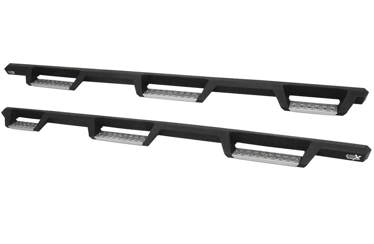 Eye-Catching Access Bars. If you’re looking to give your Silverado 2500 HD an eye-catching style accent that matches its muscular good looks, these Store Brand HDX Textured Black Stainless Wheel-to-Wheel Drop Nerf Side Step Bars are your best bet. These wheel-to-wheel style drop nerf side step bars’ geometric design and all-black style is made even more striking by contrasting stainless steel step plates. When set against your truck’s updated design, these drop nerf side step bars add a fierce style accent to its overall rugged look. Meanwhile, these step plates feature punched-out holes that offer excellent traction when accessing your cab. Additionally, these nerf side steps are built tough, allowing them to provide added protection for your rocker panels against impact damage.