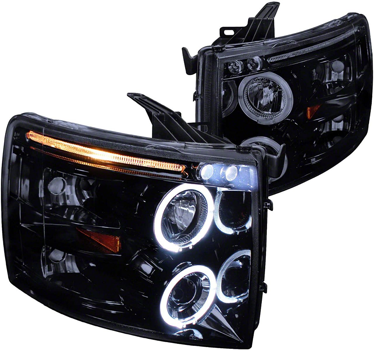 Unique New Lights. Give your Silverado a brand new look with the Dual Halo Projector Headlights in Gloss Black Housing and Smoked Lens. This pair of projector headlights have a distinctive look with its dual halo design and LED accent lights. These lights have H1 high beam and low beam bulbs, and you may use your factory bulbs for the corner lights.