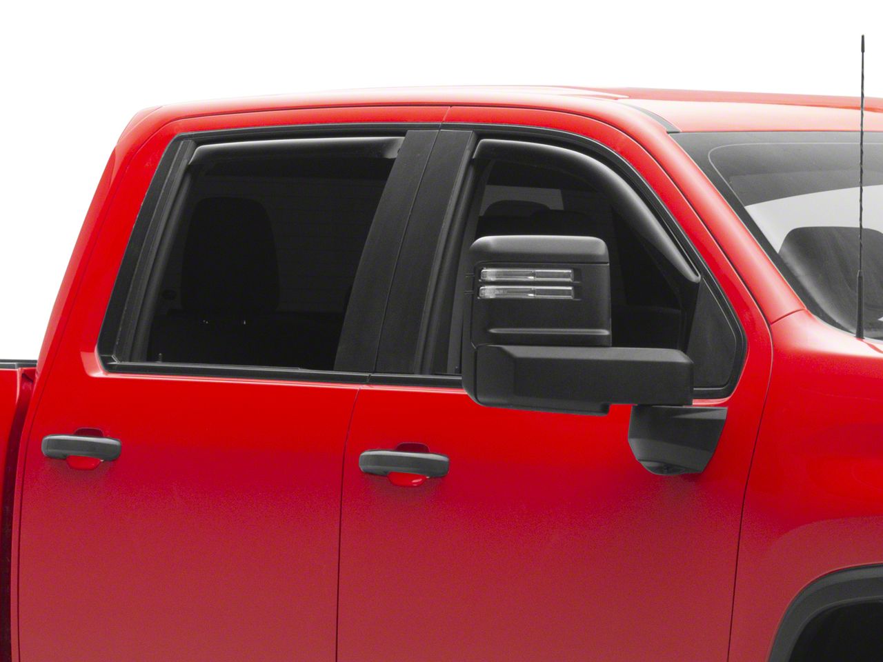 Application. The EGR In-Channel Window Visors; Front and Rear; Dark Smoke fits 2020-2026 Silverado 2500 HD Crew Cab models.